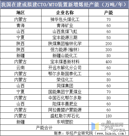 我国在建或拟建CTO/MTO装置新增烯烃产能(万吨/年)