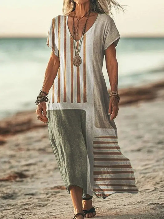 • Women’s Retro Positioning Printed V-Neck Short Sleeve Cotton Linen Dress