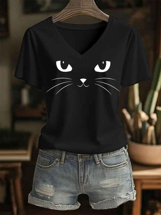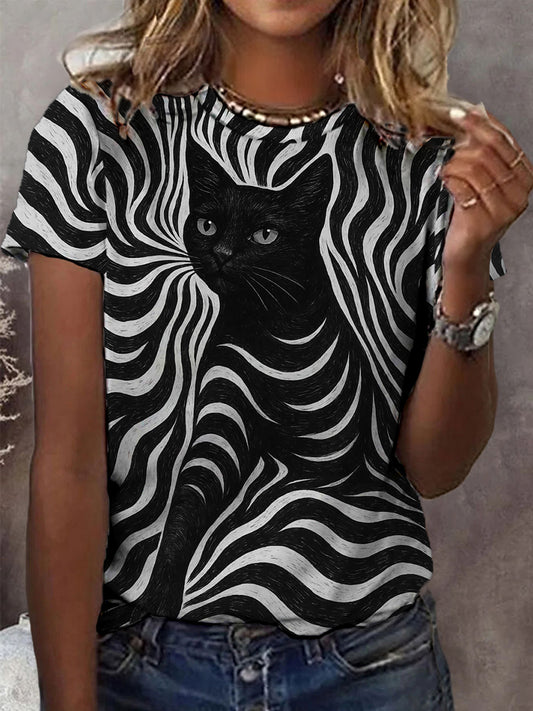 • Women’s Black Cat Stripes Print Casual Half-Sleeve Top