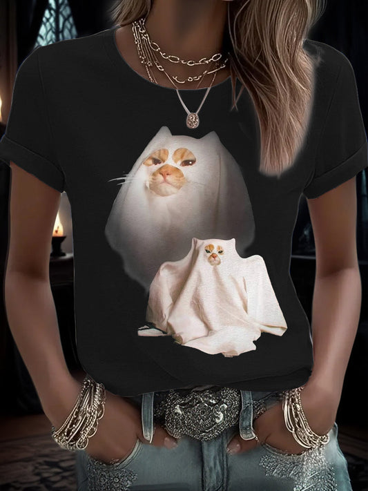 Women's Halloween Black Cat Stripes Print Casual Tee