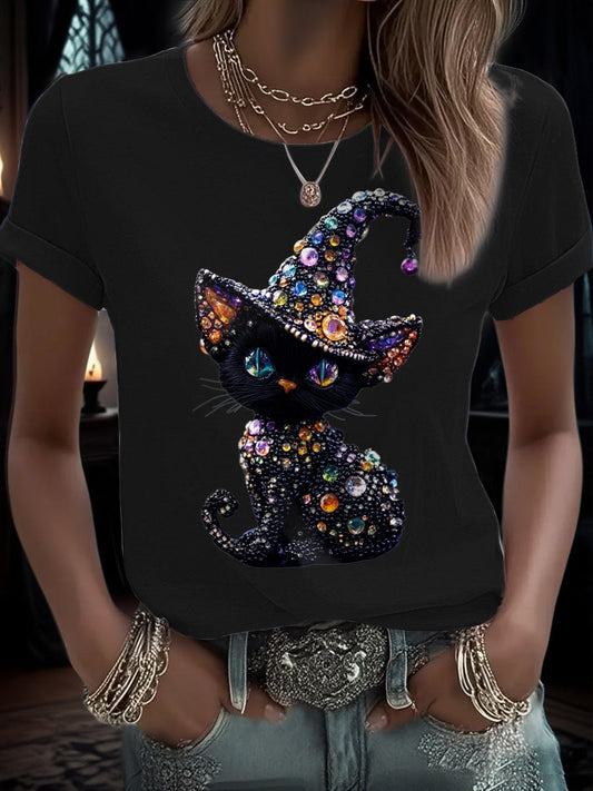 Women's Funny Halloween Cat Art Printed T-Shirt