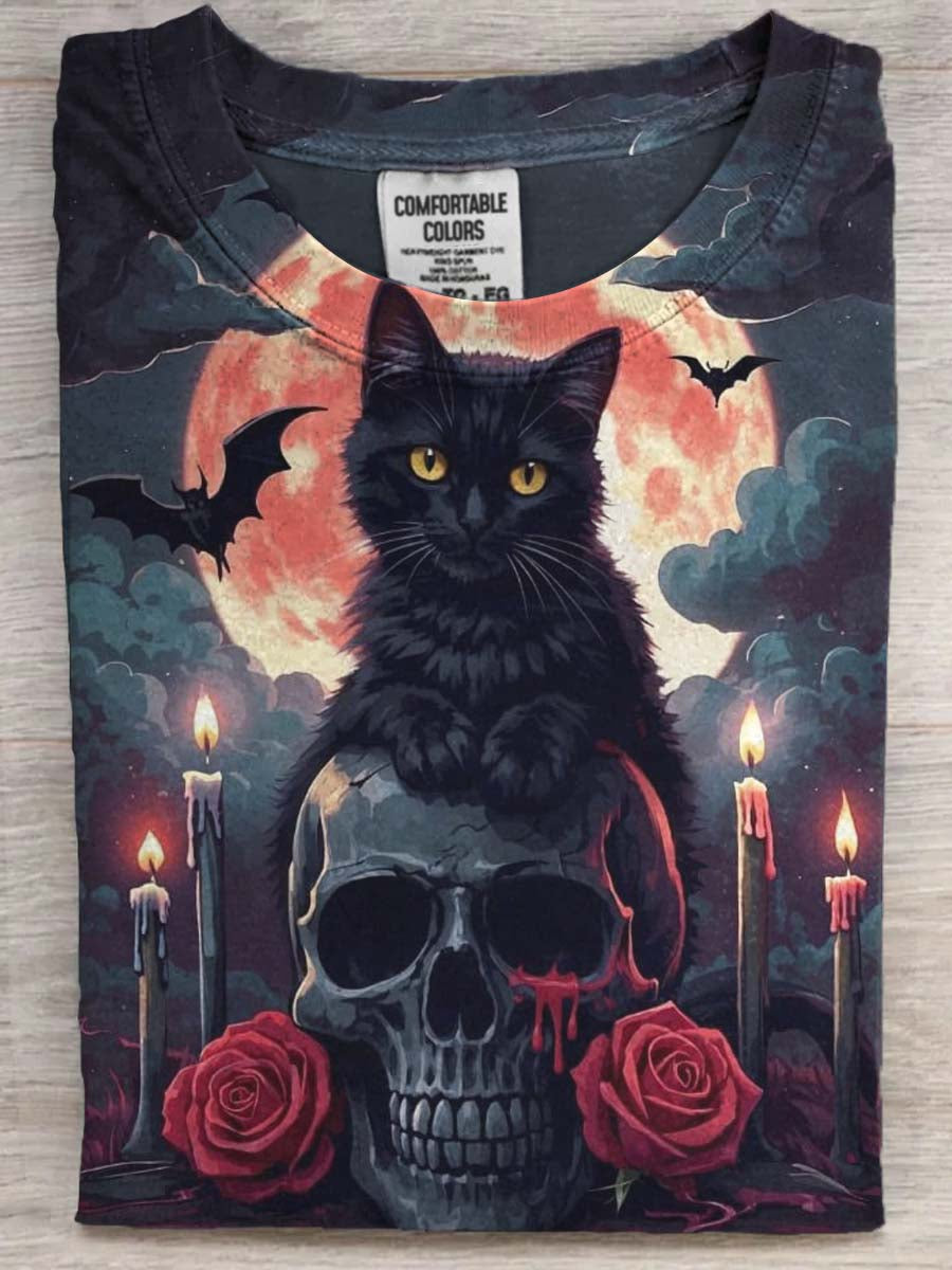 Halloween Skull Cat Print Casual Short Sleeve T-Shirt