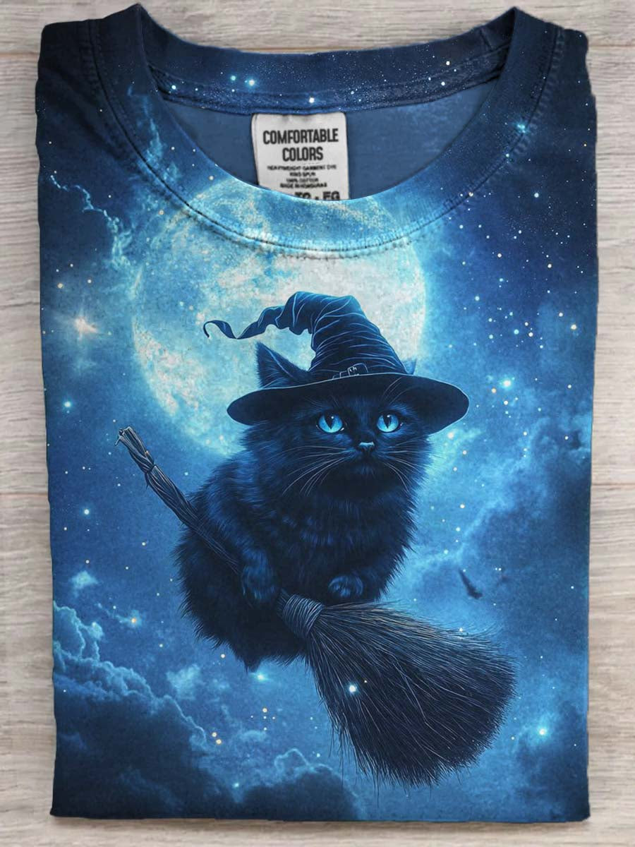 Halloween Wizard Cat Print Casual Short Sleeve T-Shirt