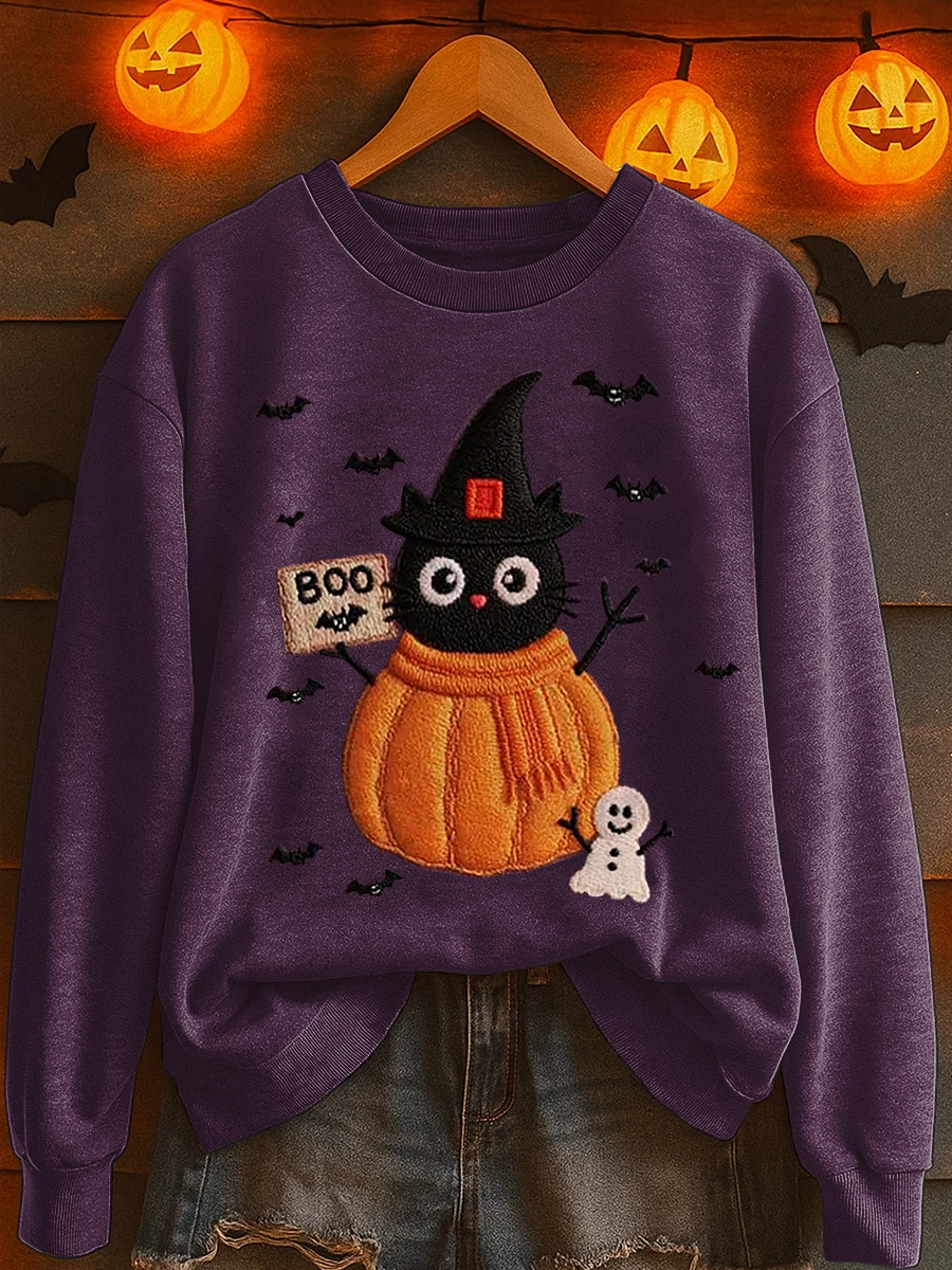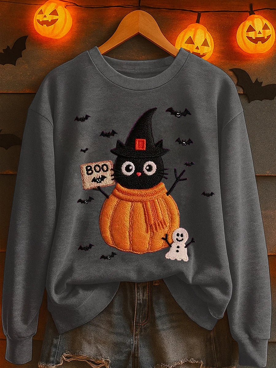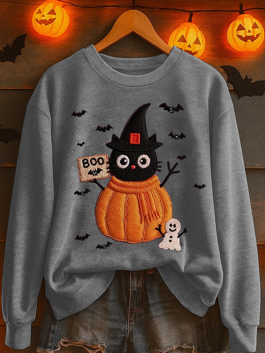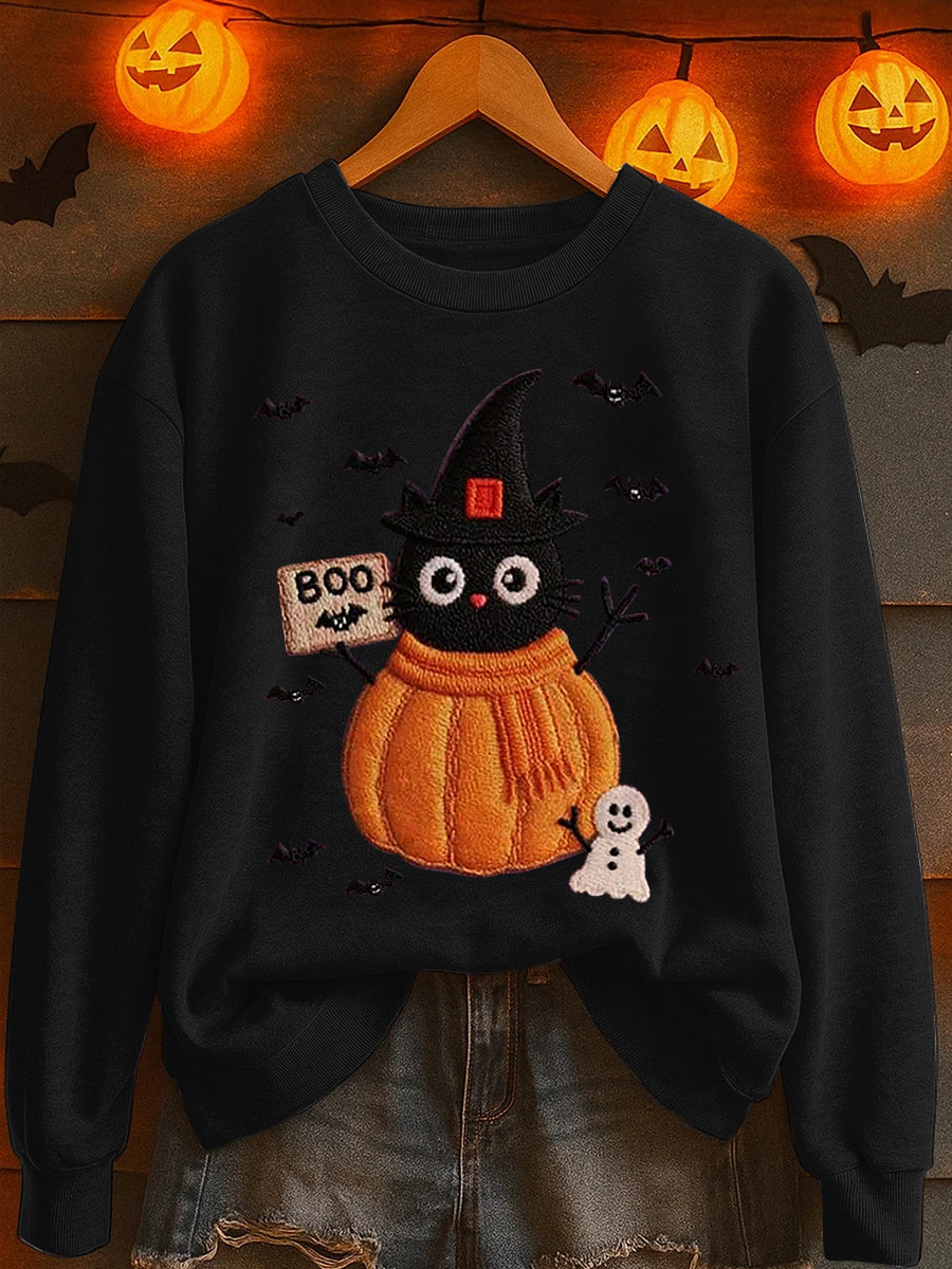 Women's Black Cat Pumpkin Print Casual Sweatshirt