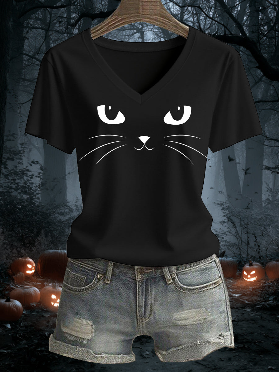 Women's Cat Print Casual V-Neck Tee