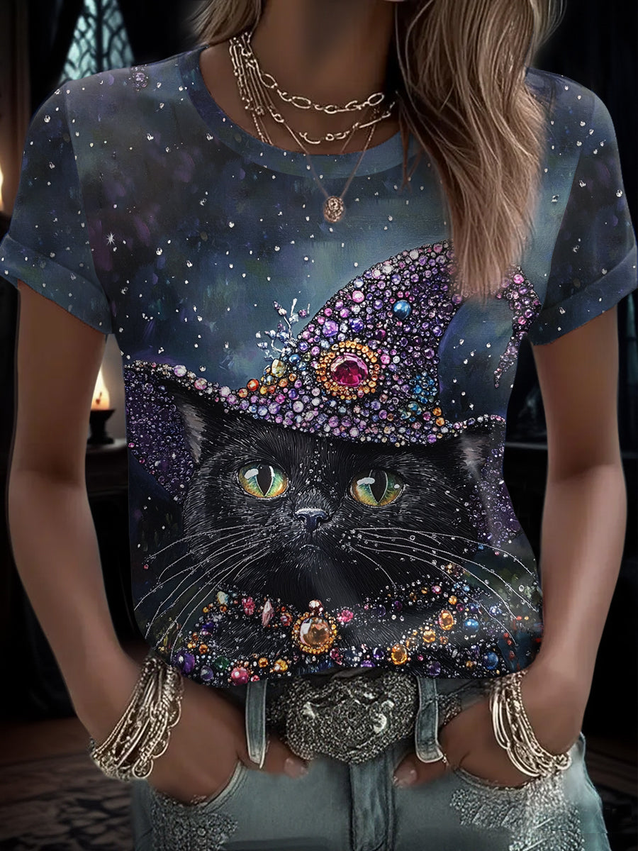 Women's Funny Halloween Cat Art Printed T-Shirt