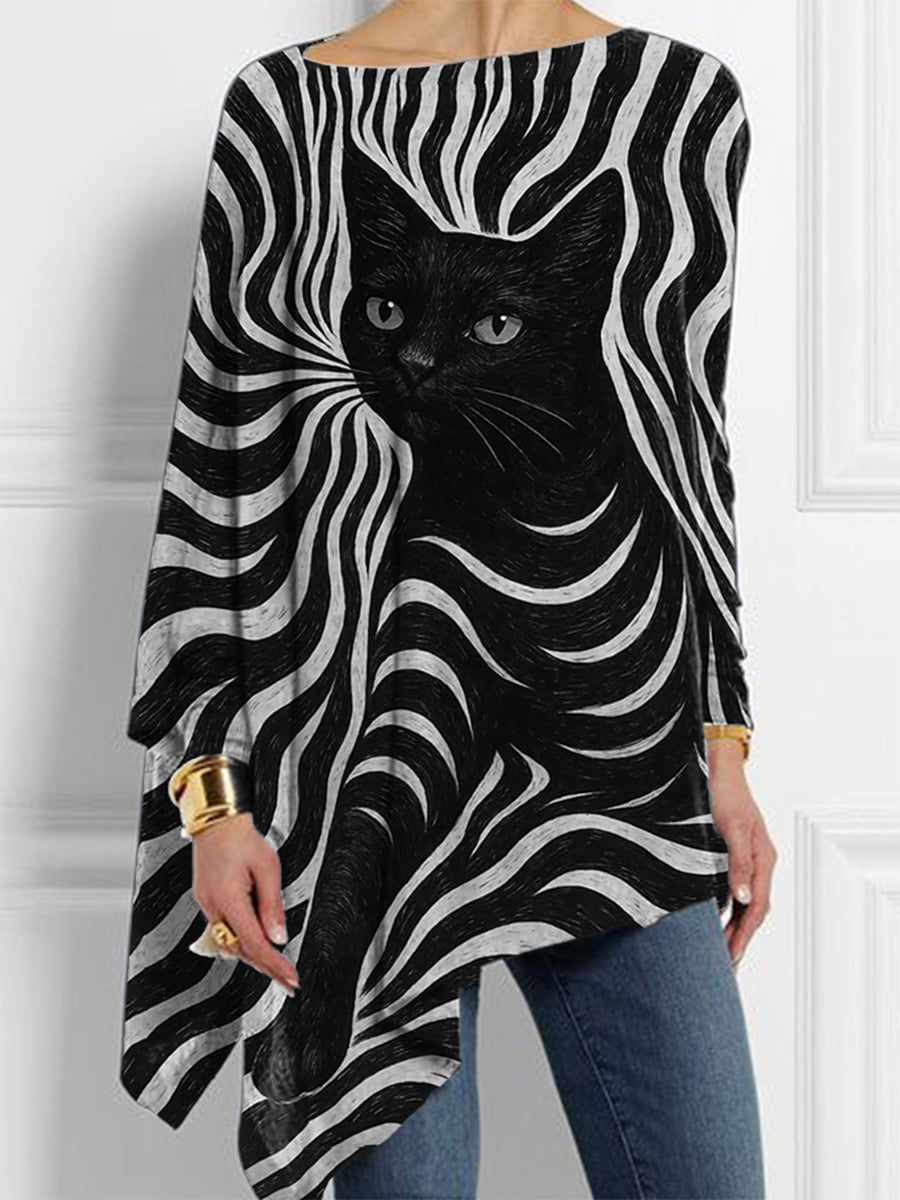 Women's Halloween Black Cat Stripes Print Casual Top