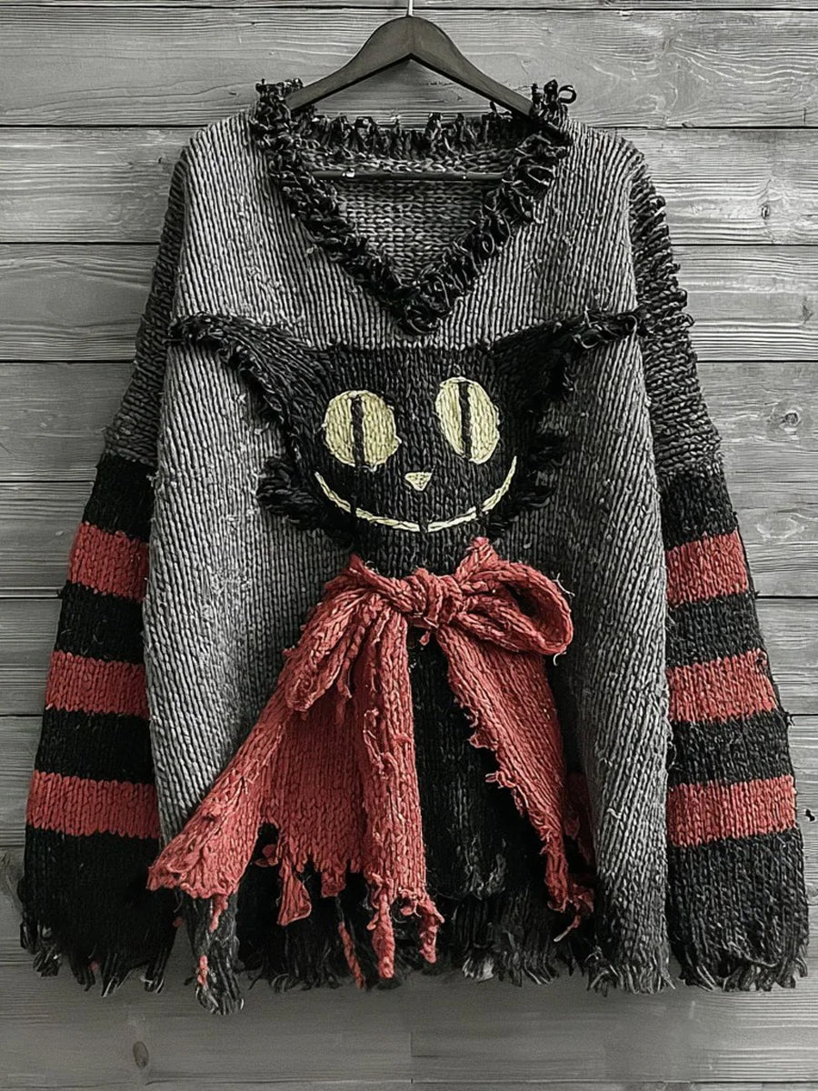 Women's Halloween Caped Black Cat Striped Art Sweater
