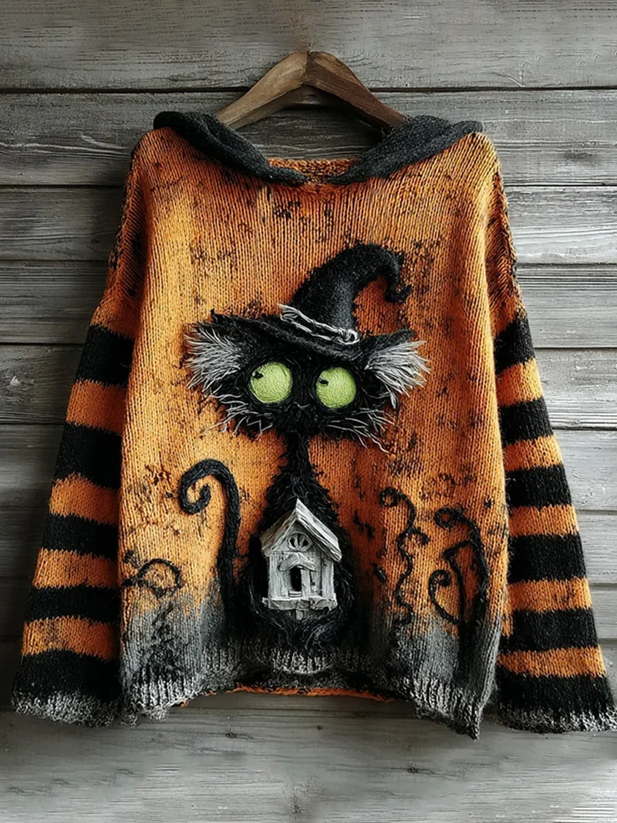 Women's Halloween Cute Witch Cats And Castle Art Crew Neck Sweater
