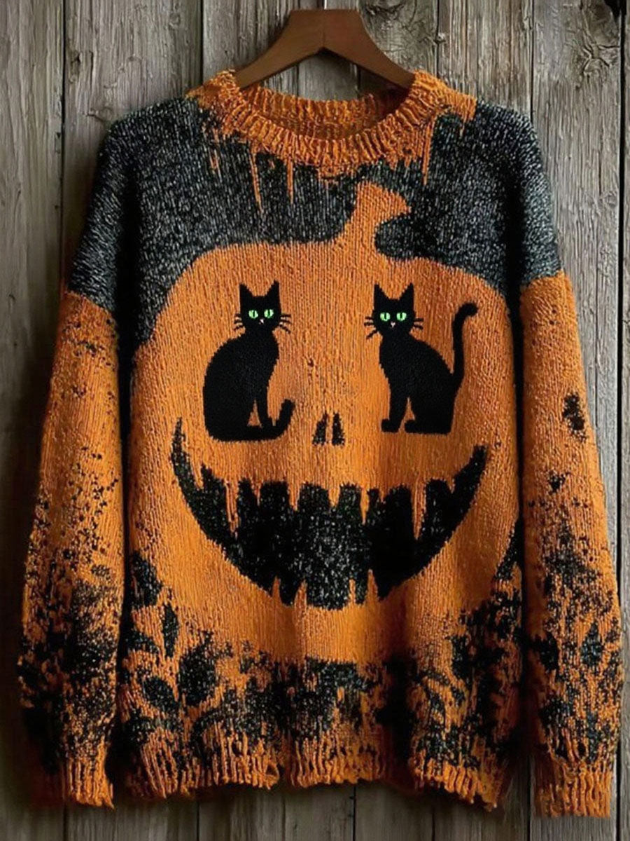 Women's Halloween Pumpkin Black Cat Knitted Sweater