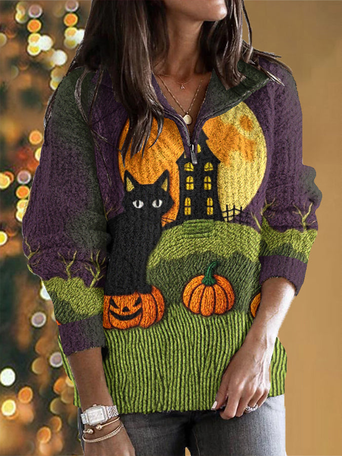 Women's Halloween Spooky Cat Embroidery Knit Zipper Sweater