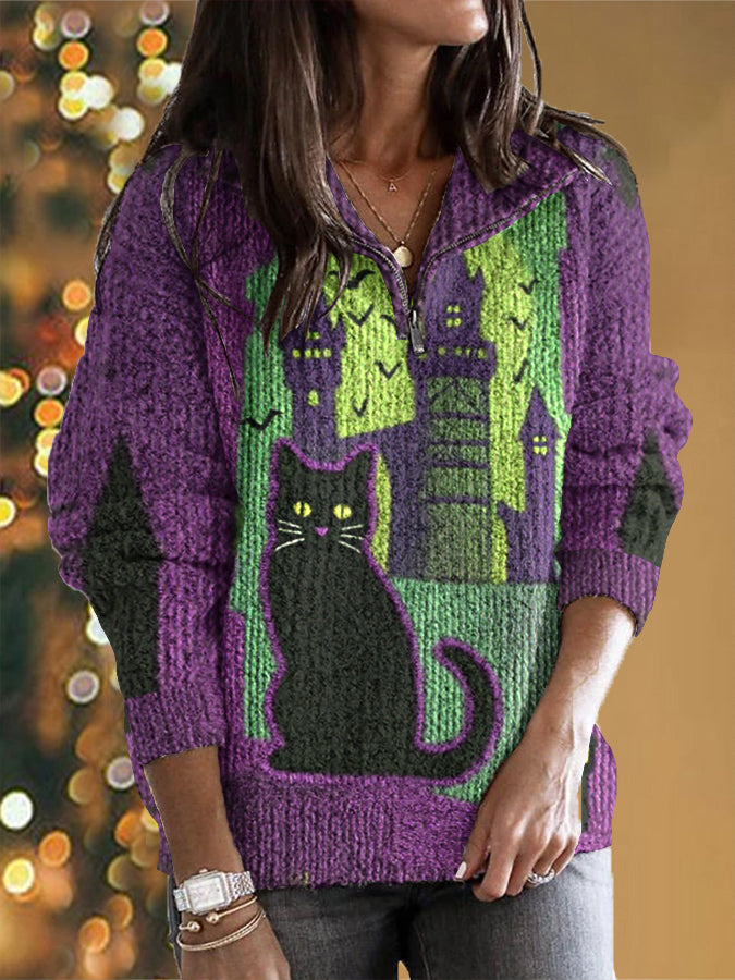 Women's Halloween Spooky Cat Embroidery Knit Zipper Sweater