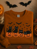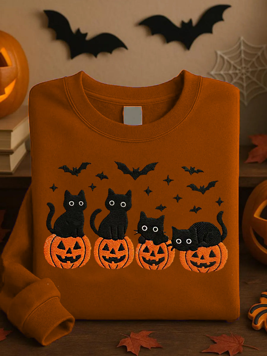 Women's Round Neck Halloween Black Cat Pumpkin Embroidery Loose Long Sleeve Sweatshirt