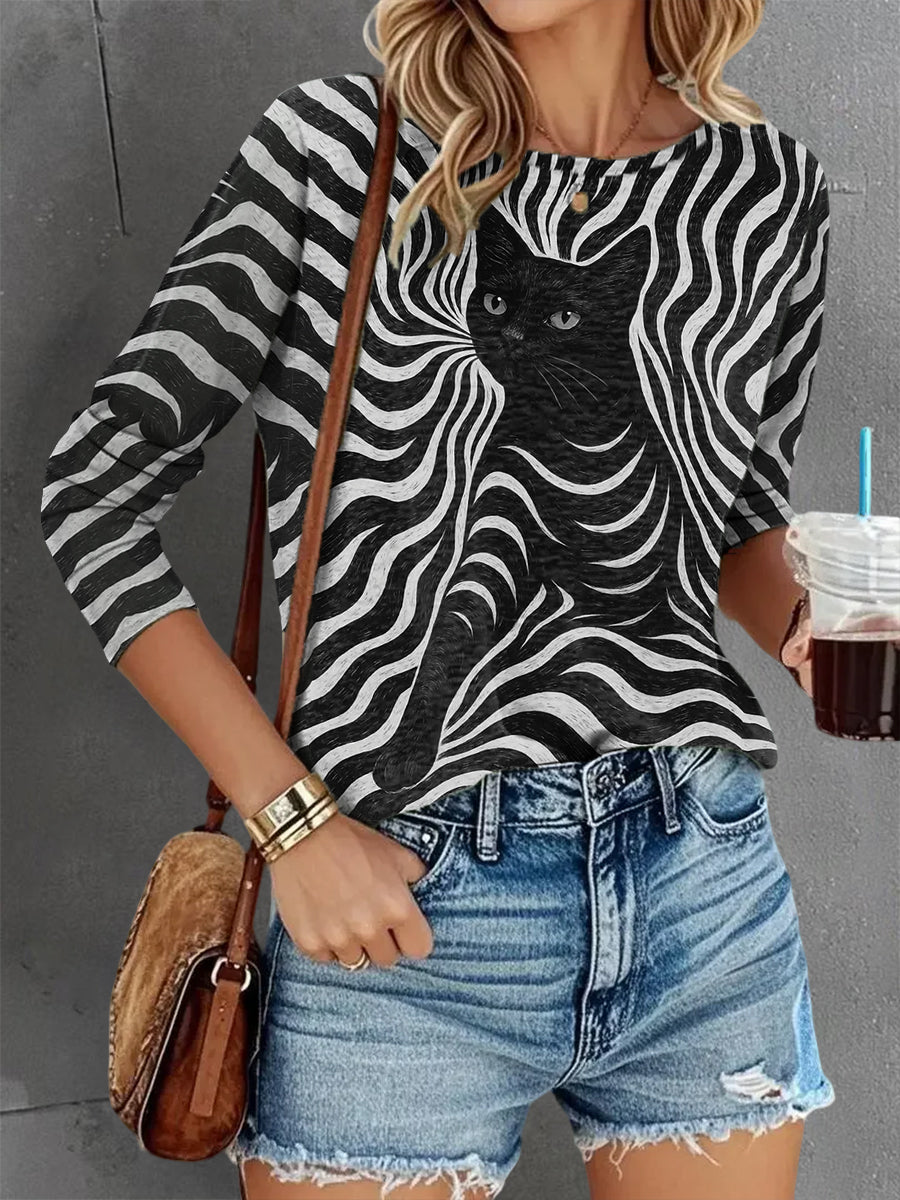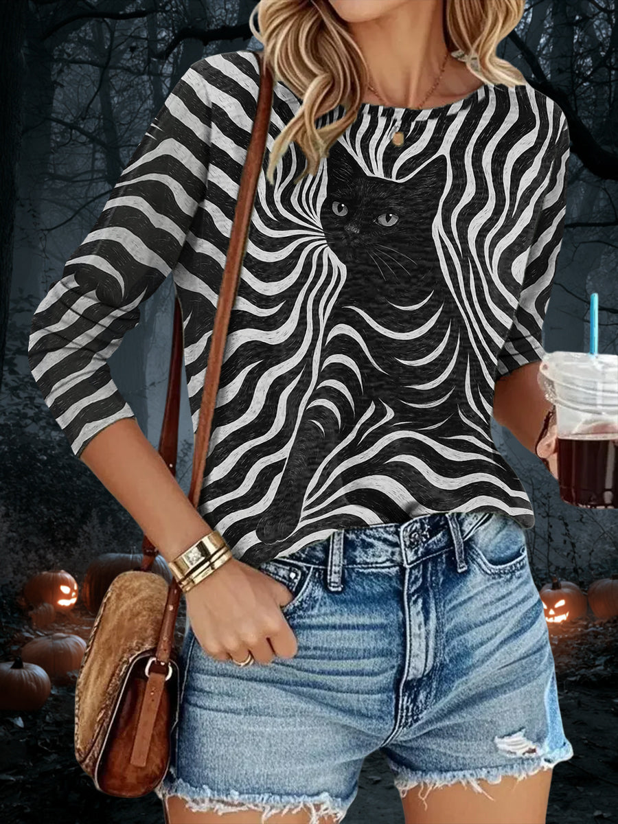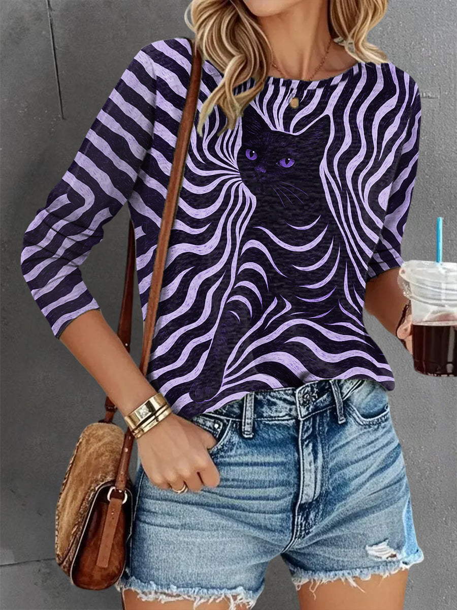 Women's Stripes Black Cat Print Casual Long Sleeve Shirt